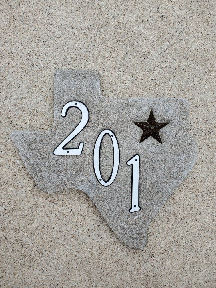 Button12x12 white cement address stone with 4 inch reflextive rubber numbers and two coats of acrylic clear coat added when dry. (3,4,5 address digits). $35. Customize it with a charm for $5 extra.