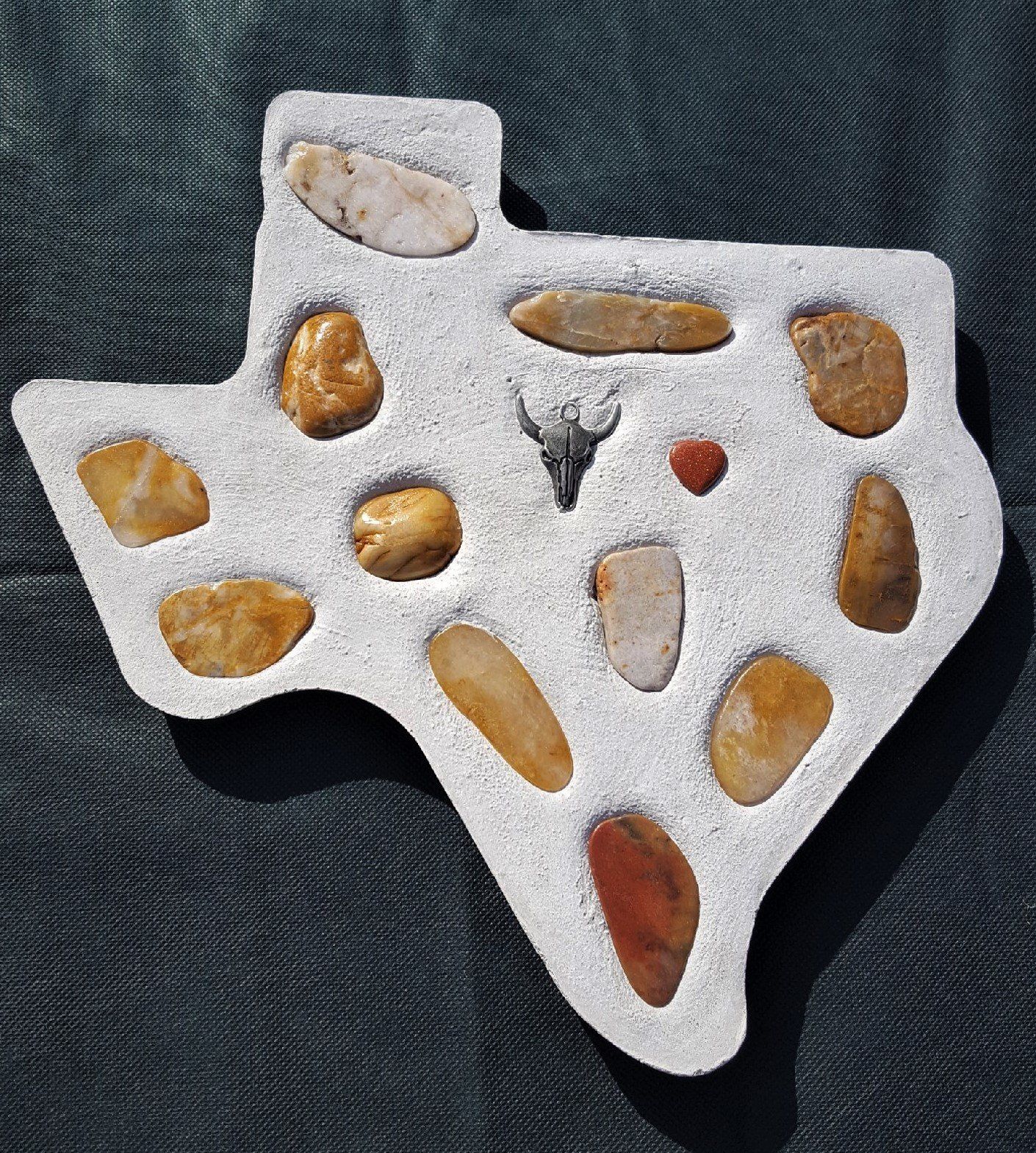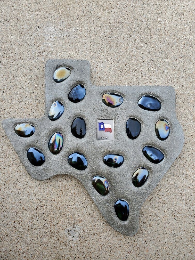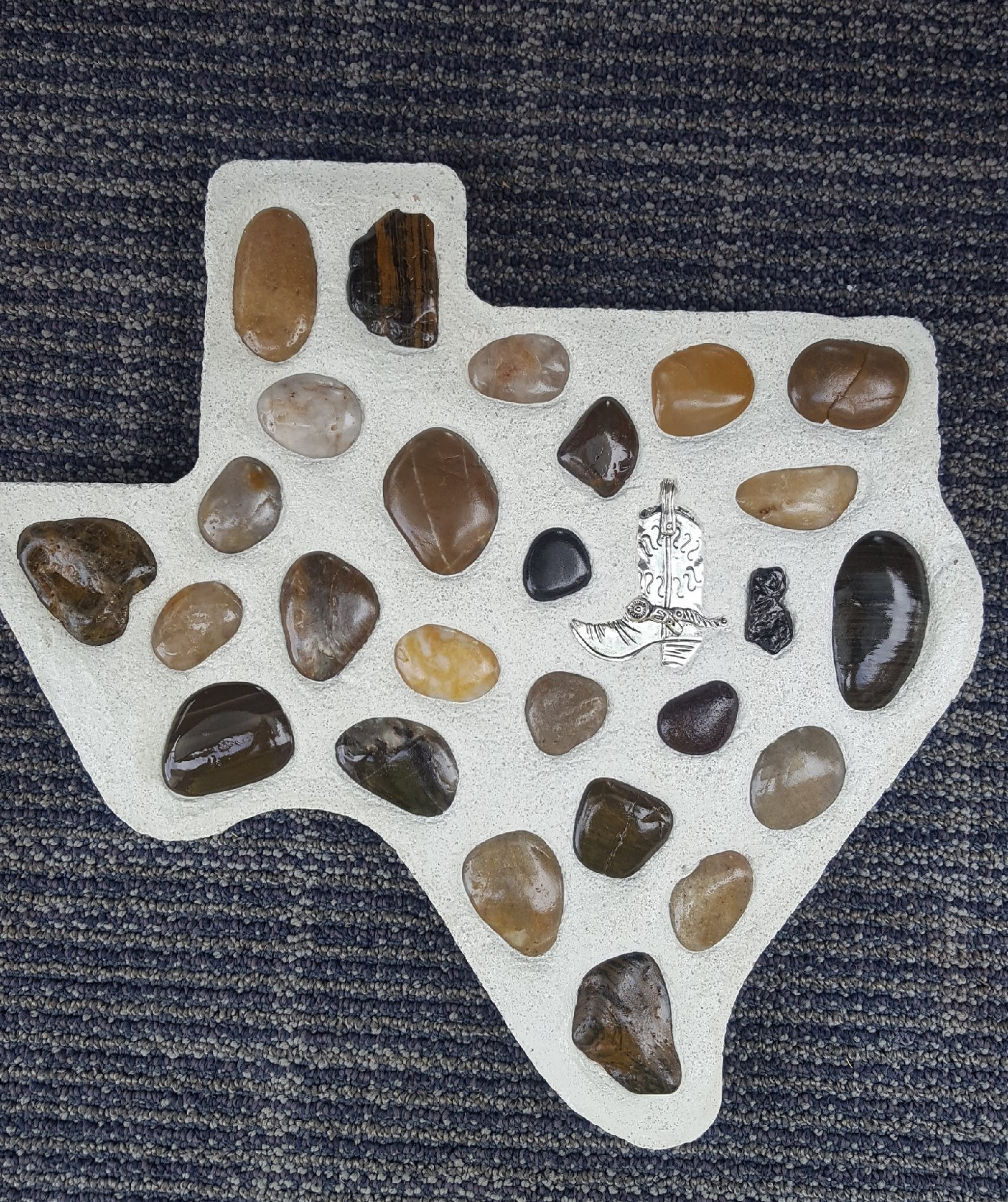 ButtonThe Texas State with in the stone in white cement surrounded by various colored flat stones, then coated with 2 coats of clear acrylic. $30
