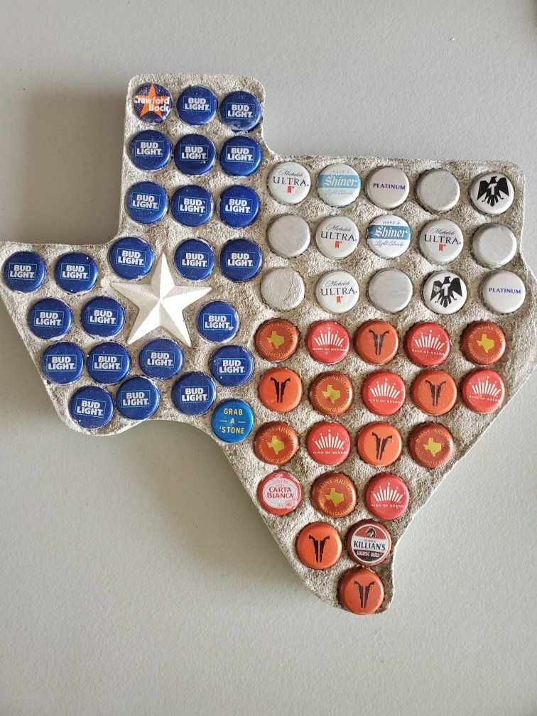 Button12x12 Grey cement stone with white star and various bottle caps in place to resemble the Texas Flag.