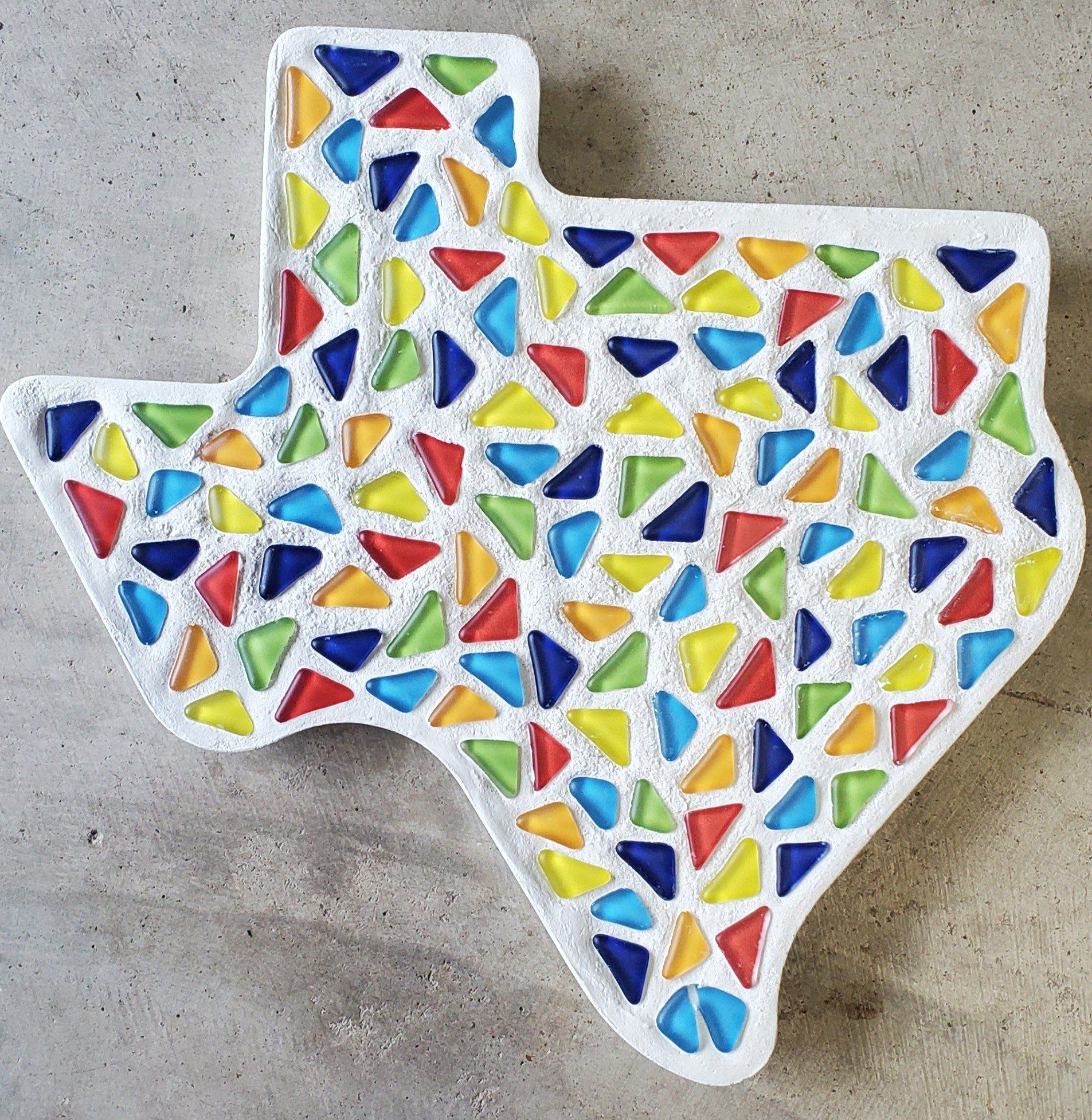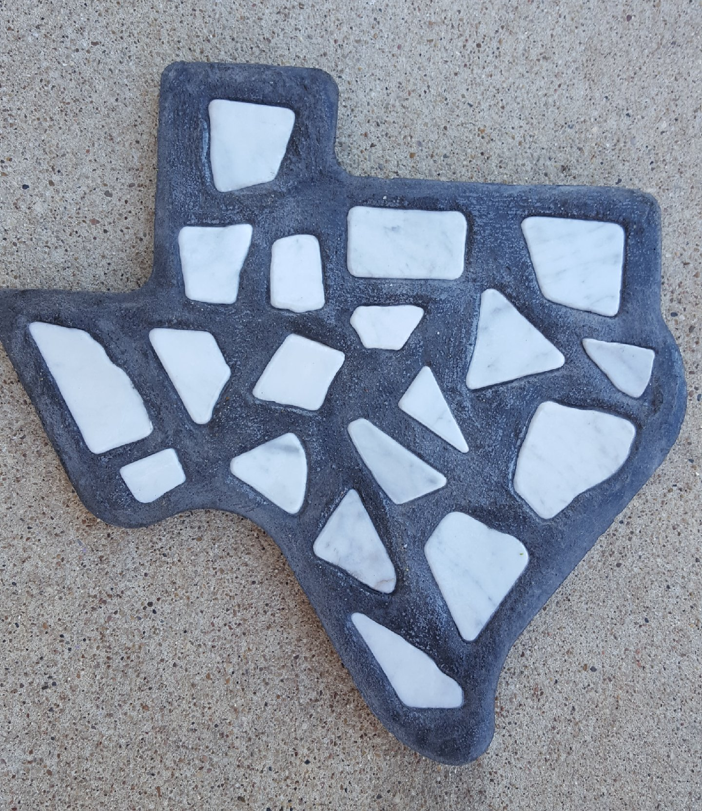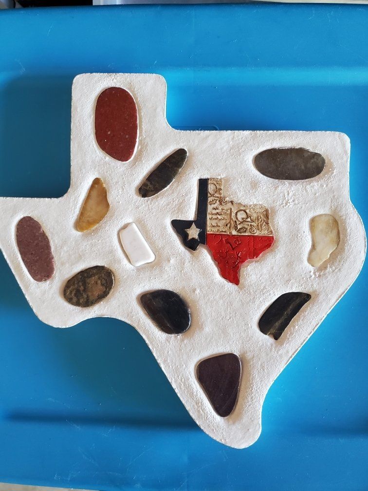 Button12x12 white cement with Texas shaped map of Texas charm inserted in stone surrounded by assorted colored stones. Topped with 2 coats of acrylic clear coat after drying. $25. (1) Available.