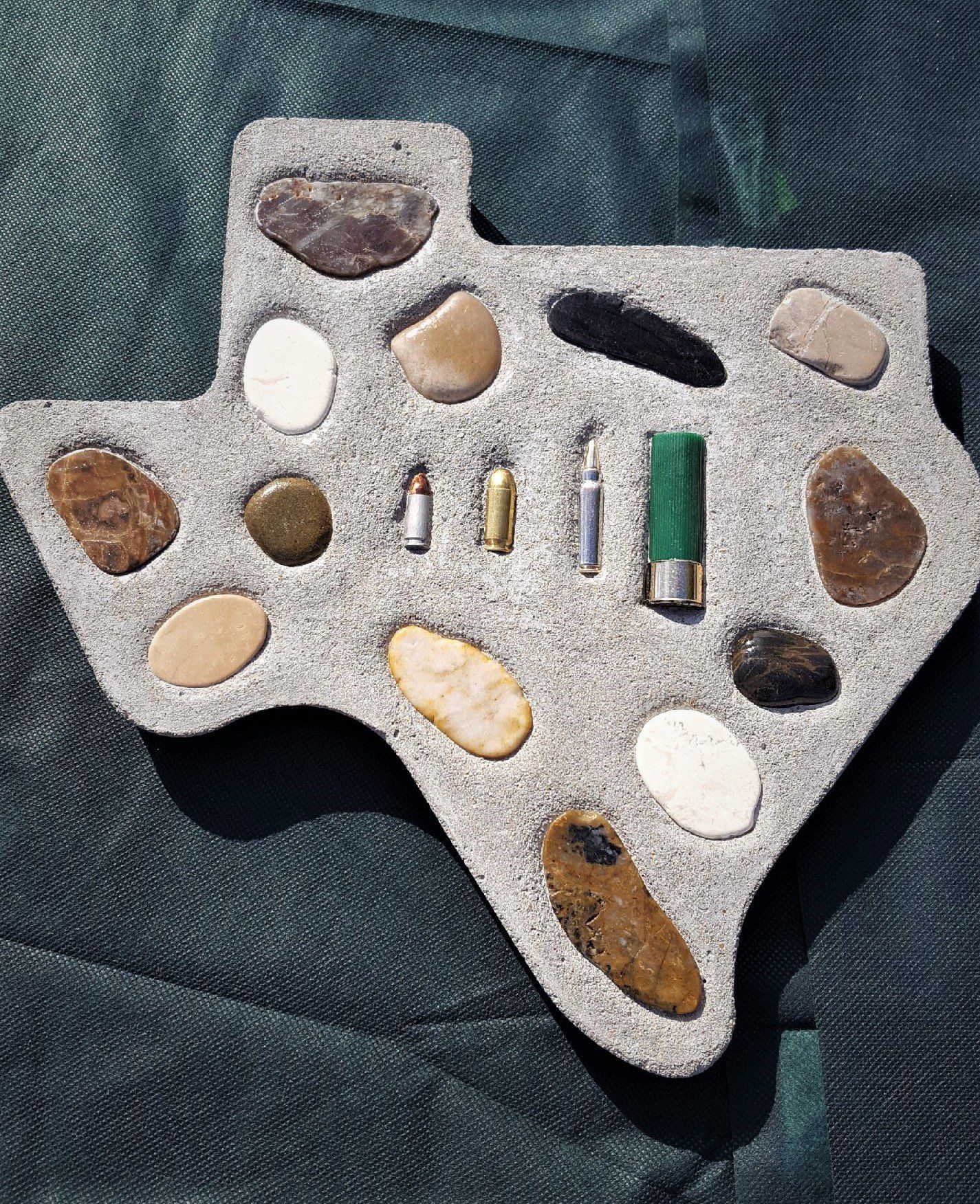 Button12x12 grey cement with a .223 replica bullet, 9mm replica bullet, and .45 replica bullet surrounded by assorted colored stones, topped off with 2 coats of acrylic clear coating after drying. $40. (1) Available and can reproduce.