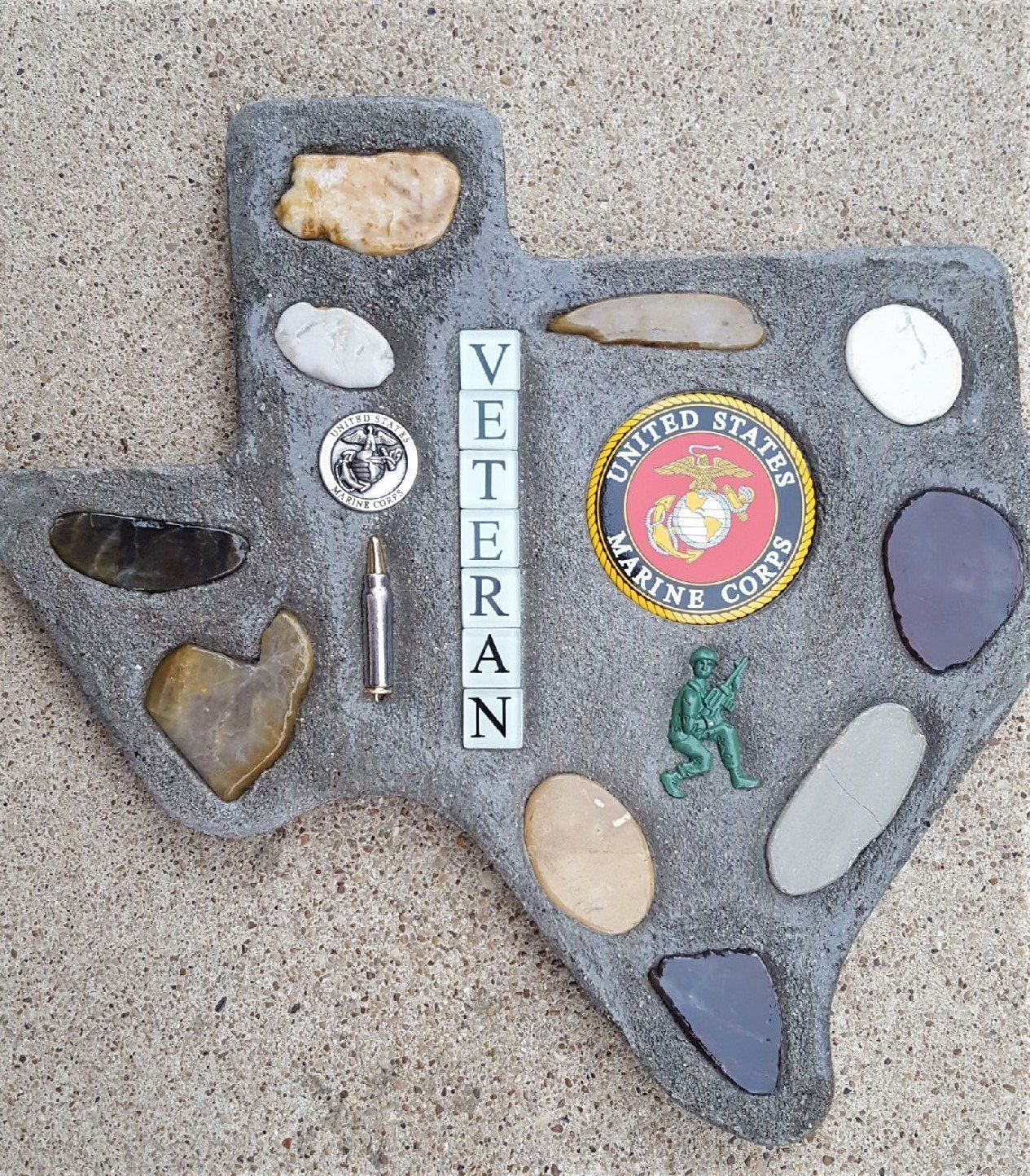 Button12x12 grey cement with USMC button, USMC symbol, soldier figurine, .223 replica bullet, and Veteran lettering (availability varies) inserted, surrounded by assorted colored stones. Topped with 2 coats of acrylic clear coating. $35. Not Available.