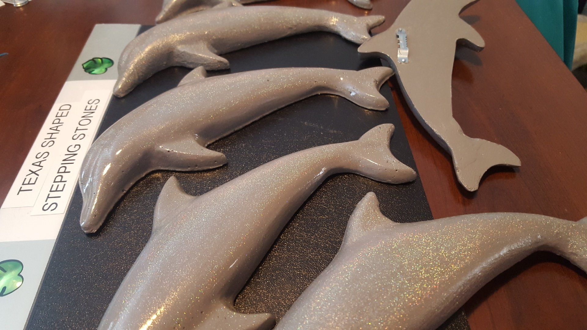 Button9x5x1.5 grey and "New Aqua" cement shaped dolphins painted with acrylic translucent