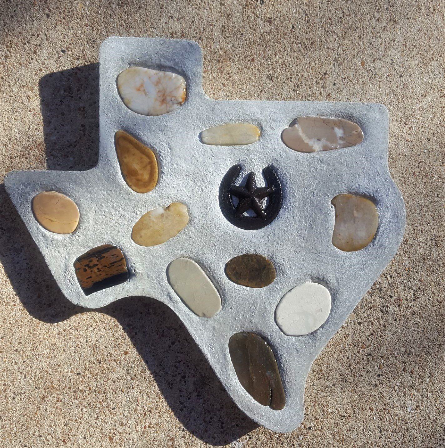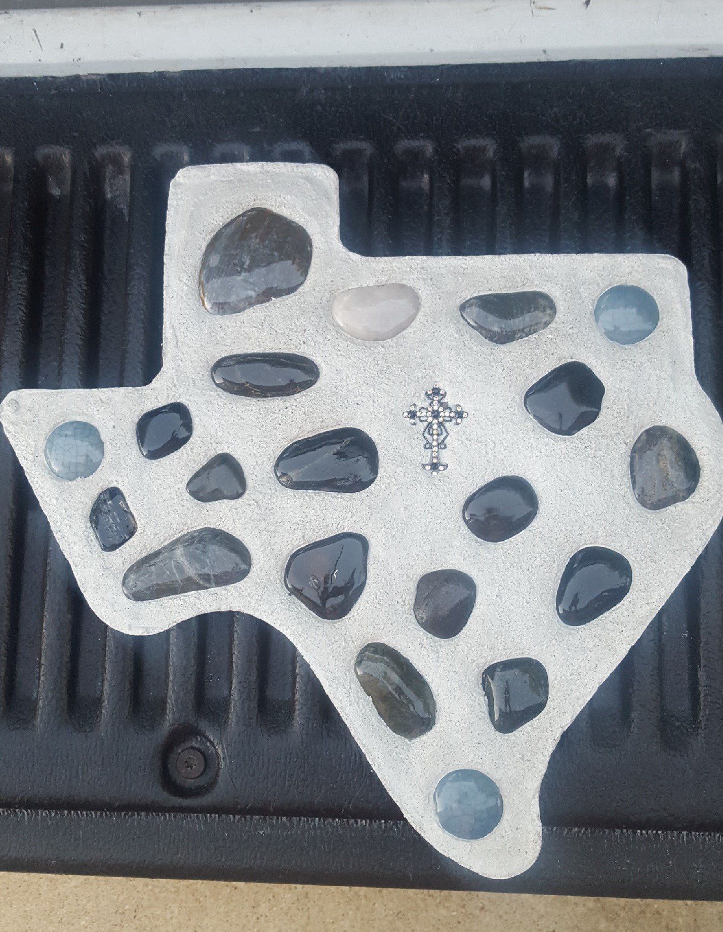 Button12x12 white cement with small iron Texas star inserted and surrounded by assorted stones. Topped off with 2 coats of acrylic clear coat after drying. $30. (1) Available and can reproduce.